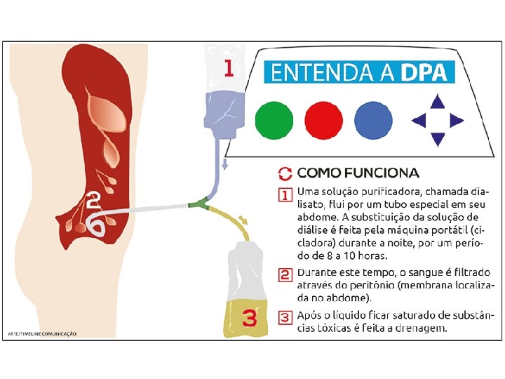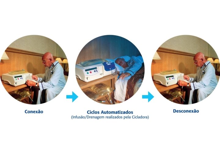 Tipos de Diálise Peritoneal • Diálise Peritoneal Automatizada (DPA): realizada todos os dias, normalmente à noite, em casa, utilizando uma pequena máquina cicladora, que infunde e drena o líquido, fazendo as trocas do líquido. Antes de dormir, o paciente conecta seà máquina, que faz as trocas automaticamente de acordo com a prescrição médica. A drenagem é realizada conectando a linha de saída a um ralo sanitário e/ou recipiente rígido para grandes volumes. Durante o dia, se necessário, podem ser programadas “trocas manuais”.