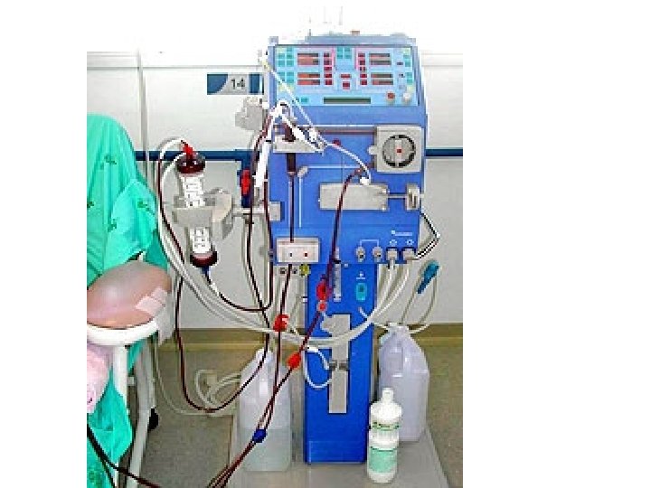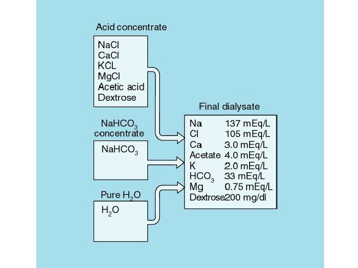 Soluções para Diálise • Nas sessões de hemodiálise são empregadas duas soluções concentradas; • Alcalina e ácida. • Durante a sessão, as duas soluções são continuamente aspiradas e misturadas com água tratada, constituindo o banho de diálise diluído, com p. H na faixa de 6, 8 7, 3 e sem risco de precipitação de sais de cálcio ou magnésio. • A composição comum das soluções são: potássio, sódio, cálcio, magnésio, cloro, acetato, bicarbonato, dextrose e dióxido de carbono. As concentrações deste componentes podem variar, mas normalmente esta solução tem a concentração semelhante ao plasma do individuo normal.