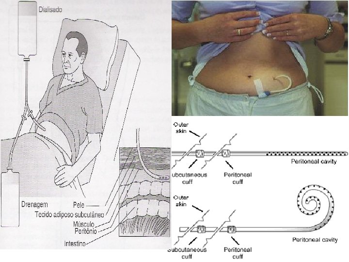Diálise Peritoneal • O processo ocorre dentro do corpo do paciente, com auxílio de um filtro natural como substituto da função renal. Esse filtro é denominado peritônio. É uma membrana porosa e semipermeável, que reveste os principais órgãos abdominais. O espaço entre esses órgãos é a cavidade peritoneal. • É realizada com a introdução por gravidade de 1 a 3 litros de uma solução salina contendo dextrose na cavidade peritoneal, através de um cateter, e permanece na cavidade por determinado intervalo de tempo. Passado cerca de 6 à 10 horas, a solução é drenada rica em excretas; • ü ü ü MATERIAIS USADOS Solução de diálise (Na, K, Mg, Ca, Cloreto, dextrose e lactato); Conjuntos intermediários (Equipos); Cateteres: rígido e flexível (cateter de Tenckhoff);