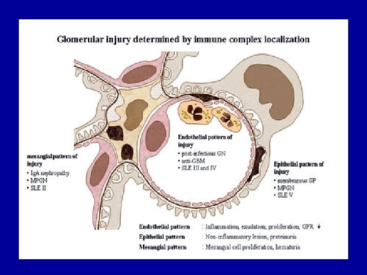 Lesioni Glomerulari : Meccanismi Antigene + Anticorpo Ø Immunocomplessi Ø Anti MBG abs Lesione Immunologica Attivazione Complemento Ø Chinine Plasmina Fibrina Ø Ø Chemotassi Permeabilizzazione Necrosi Aggregaz. Piastrine Inflammazione Coagulazione