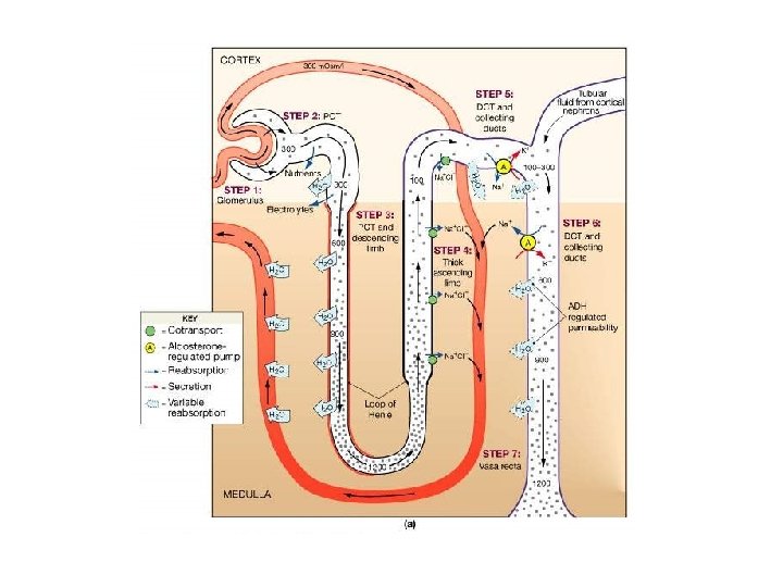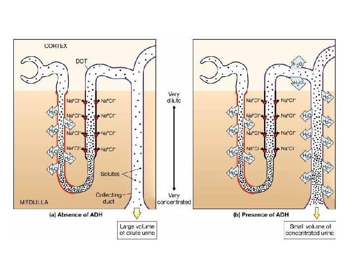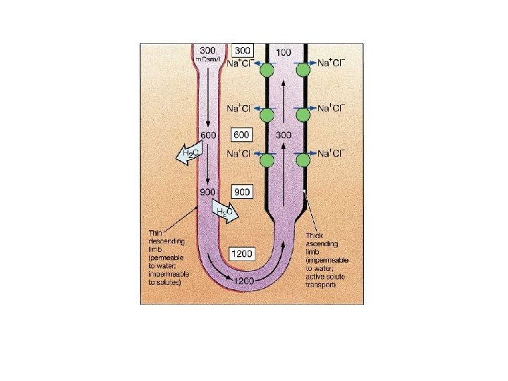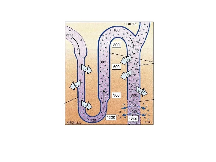 180 litrów ultrafiltratu hipotoniczny przesącz 100 -300 ADH mocznik 300 300 65 -75% ultrafiltratu – wchłanianie izoosmotyczne izoosmot. przesącz 300 Na H 2 O mocznik 1200 hiperosmotyczny przesącz 1200