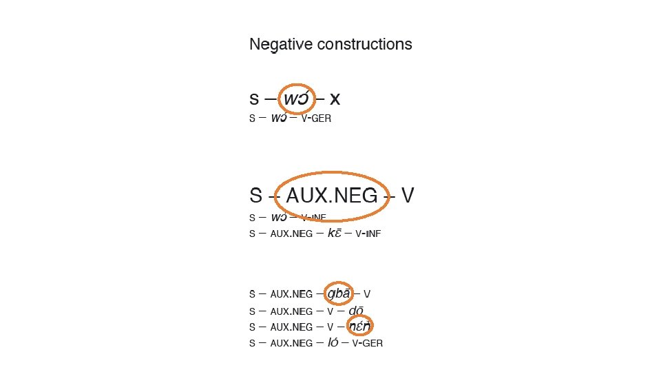 Copulas and auxiliaries • Affirmative copulas: lɛ (general), wɔ (presentative, visible/invisible), gɛ (presentative, visible) • Negative copula: wɔ • Series of auxiliaries: EXI (existential), PST (past), PRF (perfect), IPFV (imperfective), CONJ (conjunctive), NEG (negative), PROH (prohibitive), SUBJ (subjunctive), PROSP (prospective), DUB (dubitative)