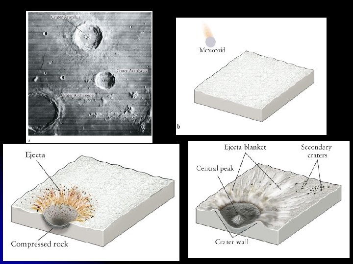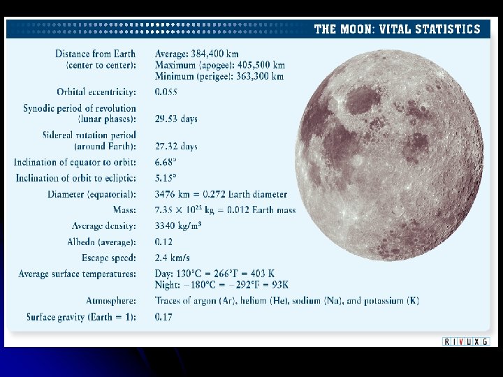 The Moon and Tides l l The Moon has heavily cratered highlands and relatively smooth-surfaced maria. Powdered into regolith, the anorthosite rock of the highland is brighter than the powdered basalt of the maria. Many lunar rock samples are solidified lava formed largely of minerals also found in Earth rocks. Anorthositic rock in the lunar highlands was formed between 4. 0 and 4. 3 billion years ago, whereas the mare basalts solidified between 3. 1 and 3. 8 billion years ago. The Moon’s surface has undergone very little geologic change over the past 3 billion years. Impacts have been the only significant “weathering” agent on the Moon; the Moon’s regolith (pulverized rock layer) was formed by meteoritic action. Lunar rocks brought back to Earth contain no water and are depleted of volatile elements.