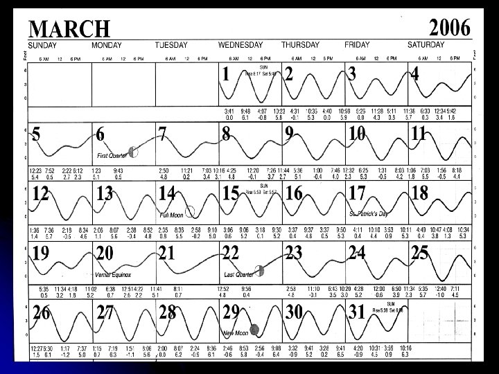 During new and full moon phases, the Sun’s gravitation boosts the tidal bulges in the During the quarter moon same direction as the phases, the Sun pulls the tidal Moon, creating larger bulges in a different direction “spring tides”. from the Moon, diminishing the tides. These are “neap tides. “