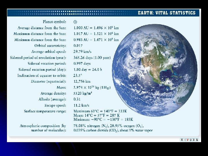 Earth: A Dynamic, Vital World l l l Study of seismic waves (vibrations produced by earthquakes) shows that Earth has a small, solid inner core surrounded by a liquid outer core. The outer core is surrounded by the dense mantle, which in turn is surrounded by the thin, low-density crust. Earth’s inner and outer cores are composed primarily of iron. The mantle is composed of iron-rich minerals. Earth’s magnetic field produces a magnetosphere that surrounds the planet and deflects the solar wind. Some charged particles from the solar wind are trapped in two huge, doughnut-shaped rings called the Van Allen belts. An Earthward deluge of particles from a coronal mass ejection on the Sun can produce exceptional auroras.
