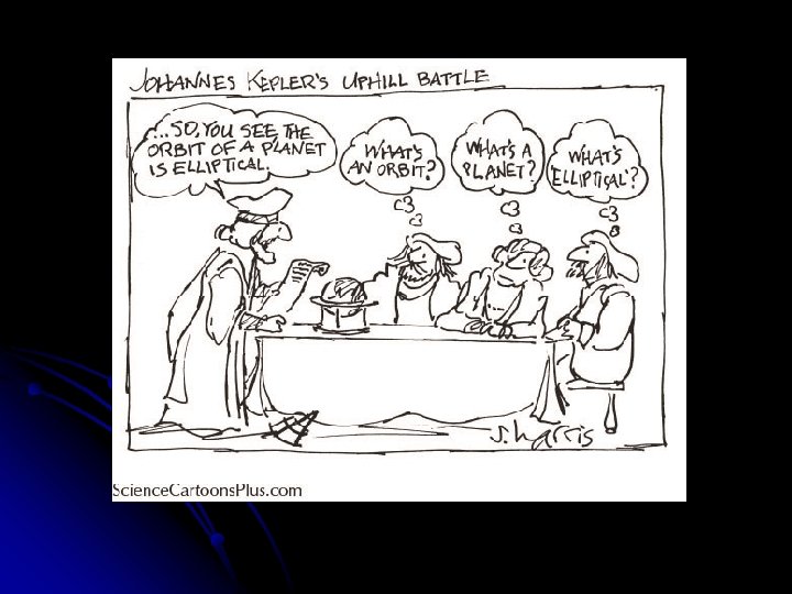 Origins of a Sun-centered Universe l l Common sense (e. g. , Earth doesn’t appear to be moving) led early natural philosophers to devise a geocentric cosmology, which placed Earth at the center of the universe. Kepler modified Copernicus’s heliocentric (Sun-centered) theory by showing that orbits are elliptical, thereby creating a simplified explanation of planetary motions compared to the geocentric theory. The heliocentric cosmology refers to motion of planets and smaller debris orbiting the Sun. Other stars do not orbit the Sun. The sidereal orbital period of a planet is measured with respect to the stars, and determines the length of the planet’s year. A planet’s synodic period is measured with respect to the Sun as seen from the moving Earth (e. g. , from one opposition to the next).