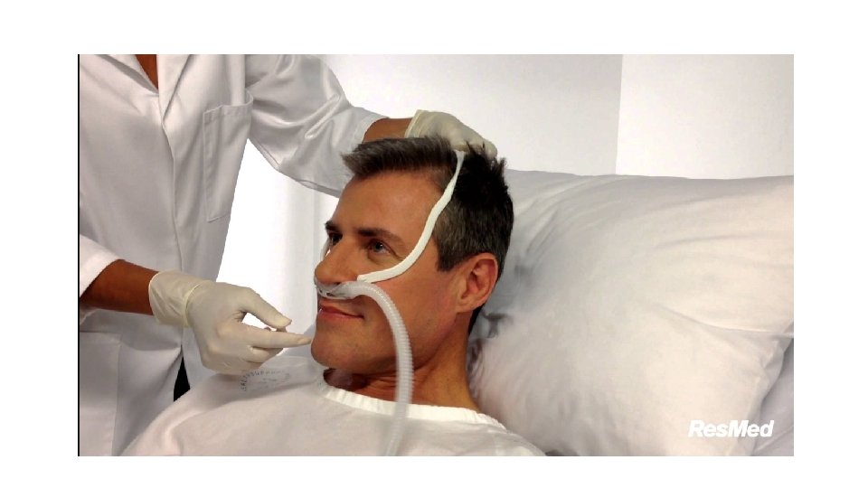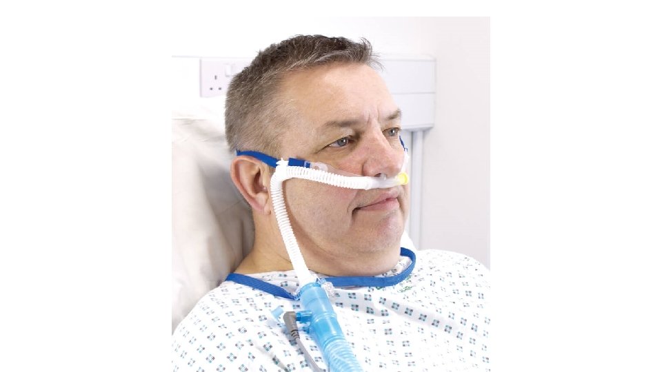 NIV – high flow nosní O 2 • Vysokoprůtokové podání O 2 nosní kanylou – 30 -60 l/min • Ohřátý a zvlhčený kyslík • Umožňuje podání vyšších Fi. O 2 a zmenšení mrtvého prostoru vydechovaného CO 2 • Neumožňuje navýšení inspiračního dechového objemu • Vytváří nízkou hladinu PEEP – cca 0, 5 cm na každé navýšení průtoku o 10 l/min