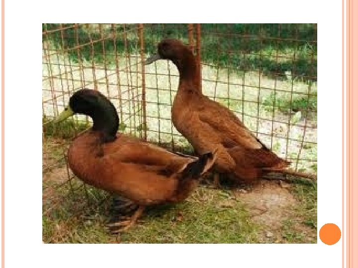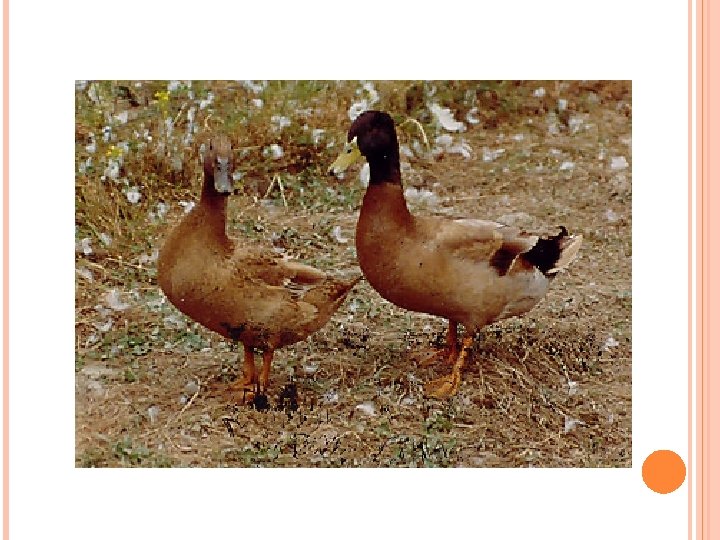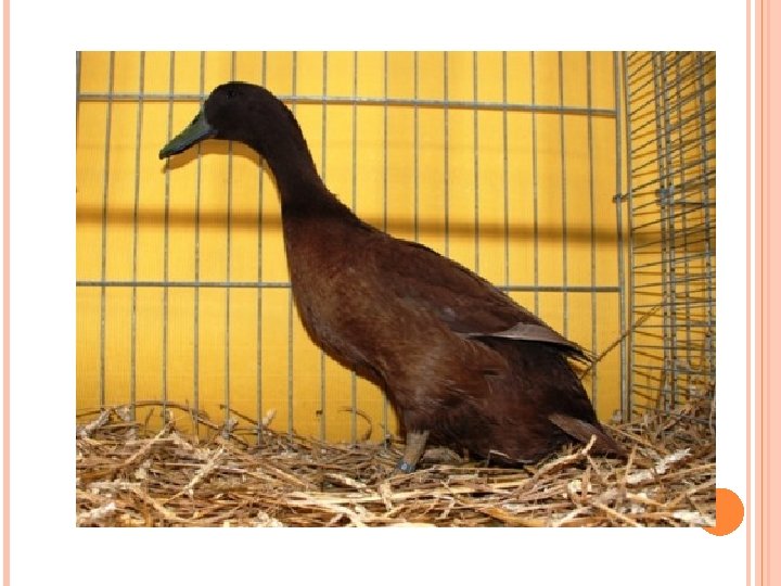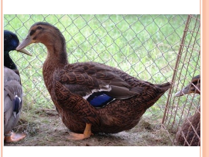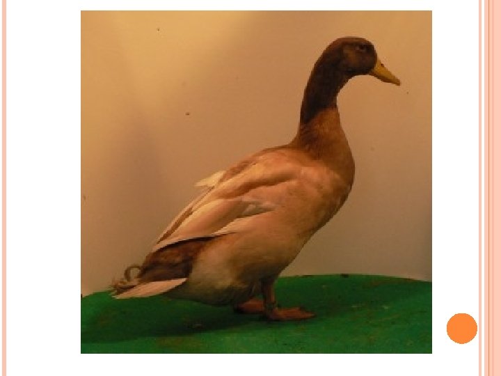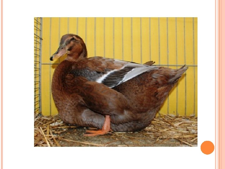 KACHNA ORPINGTONSKÁ Byla vyšlechtěna v Anglii. Má typické žlutohnědé zbarvení kačer je trošku tmavší. Má střední tělesný rámec a výrazně osvalený trup. Vyznačuje se rychlým růstem a masem velmi dobré chuti s kratším svalovým vláknem.