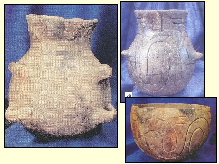 Starý neolit ☻Keramika Ln. K – kulovité a polokulovité tvary, láhve, putny, misky – výzdoba – rytá: přímé linie nebo spirály, A motiv, notová značka