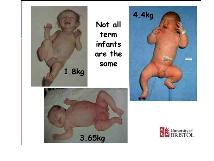 1 - Weight • Weight of F. T infants at birth is 2. 6– 3. 8 kg. • Babies less than 2. 5 kg are considered low birth weight. • Babies loose 5 – 10% of their birth weight in the first few days after birth and regain their birth weight by 7 – 10 days. • Weight gain varies between 15 -20 gm/day.