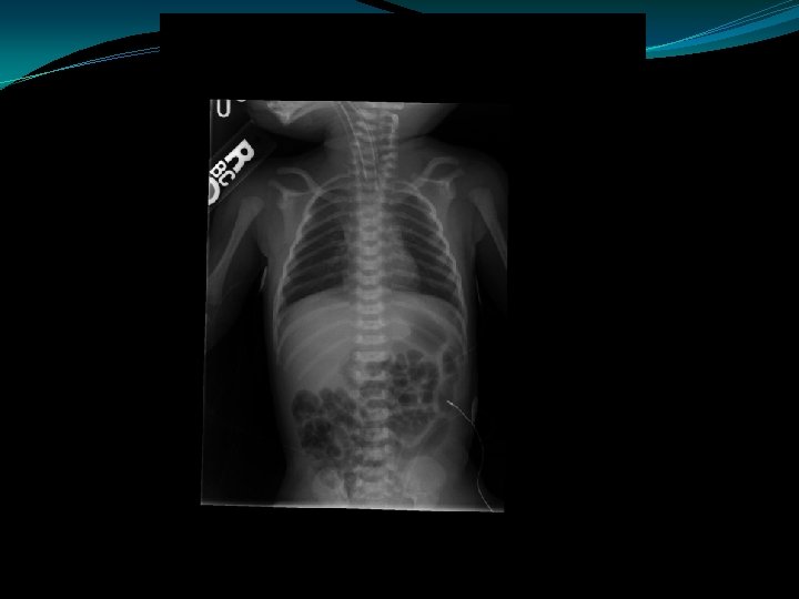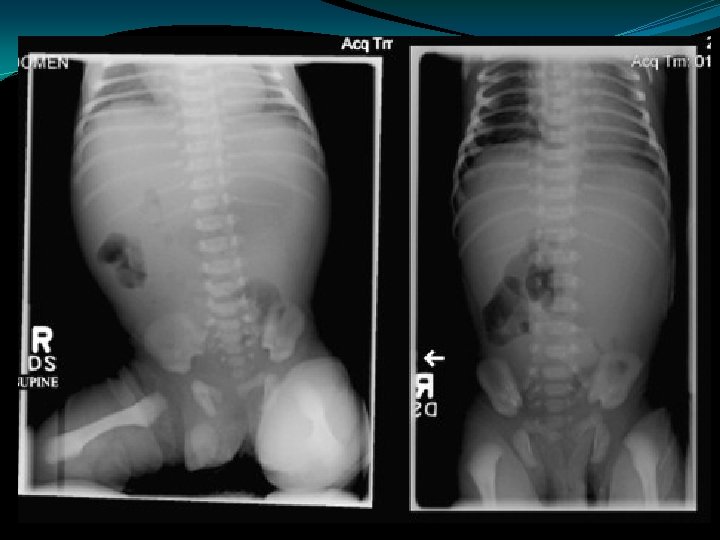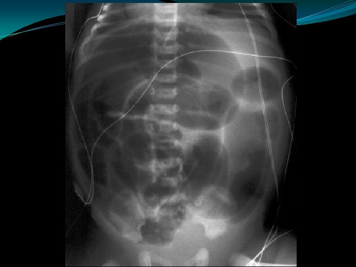 Intestinal Obstruction �Symptoms and findings might include: � Abdominal distention � Emesis (bilious) � Tenderness � Visible loops of bowel, abdominal wall erythema �Associated problems: � Respiratory compromise, apnea � Hypovolemia, hypotension � Sepsis (NEC, perforation) � Electrolyte imbalance � Neutropenia (sepsis) � Thrombocytopenia (sepsis, perforation, bowel necrosis) � Check for incarcerated inguinal hernia, imperforate anus