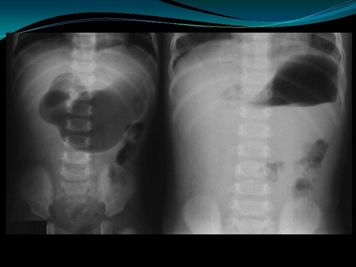 Malrotation/Volvulus Abdominal XRay �Normal film -20% �Dilated duodenal bulb and paucity of distal bowel gas �Double bubble sign �Distal gas filled bowel loops; gas filled volvulus (obstructed mesenteric veins prevent absorption of gas