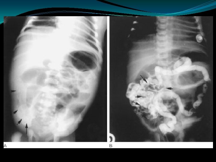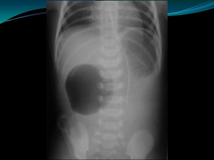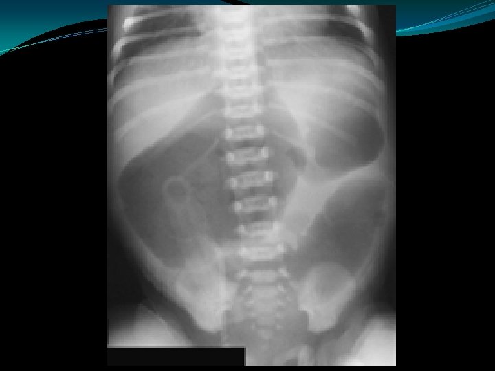 Meconium Ileus �Usually a manifestation of cystic fibrosis � 20% of infants with CF present with mec ileus �Obstruction of proximal ileum by thick, sticky round meconium pellets �Absence of air fluid levels �“soap bubbles” �Complications: �perforation, peritonitis, pseudocyst, ileal atresia/stenosis
