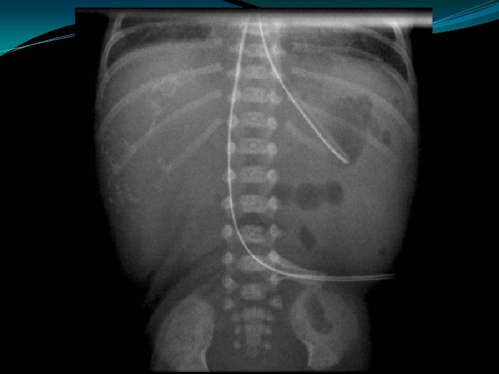Treatment of Intestinal Obstruction �NG/OG to low intermittent suction �Correct hypovolemia and hypotension � Third spacing into the lumen of the distended bowel �IV Fluids D 5/D 10 with 1/2 NS at 120 -150 m. L/kg/day �Correct electrolyte abnormalities and acidosis �Blood culture and Antibiotics � Ampicillin, Gentamicin, Flagyl (sometimes) �Respiratory support for abdominal distension or apnea