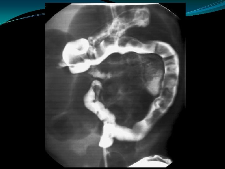 Hirschsprung’s Disease �Failure to pass meconium in 1 st 24 hrs �Absence of ganglion cells in mesenteric plexus �Most commonly rectosigmoid junction � 10% of cases involve entire colon � 10% of cases associated with Trisomy 21