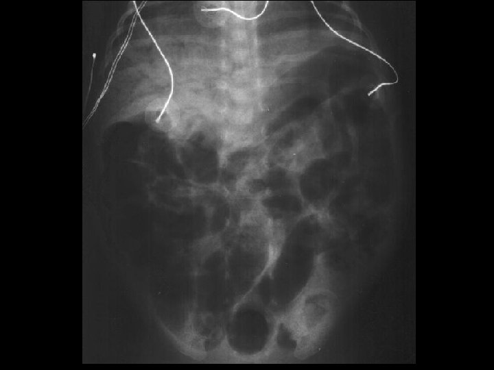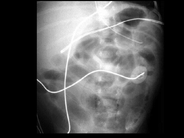 Necrotizing Enterocolitis Management NPO, OG/NG to low intermittent suction Vascular access, IV and arterial Volume, pressors to support blood pressure Blood culture, antibiotics: ampicillin, gentamicin, clindamycin Respiratory compromise and apnea are common Blood products to correct coagulopathy, anemia, and thrombocytopenia • Serial abdominal x-rays (2 views), CBC, blood gasses • • •
