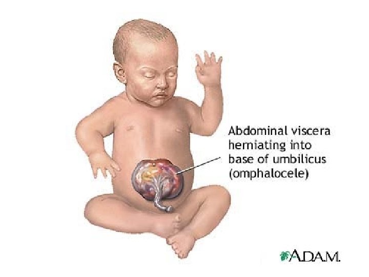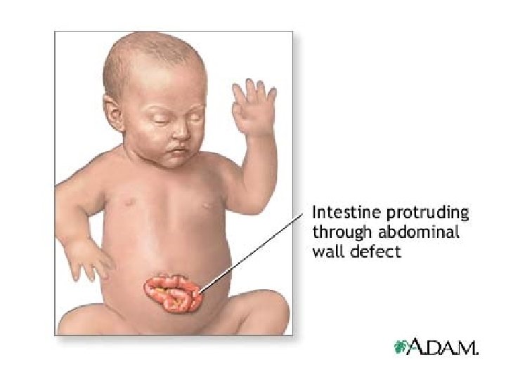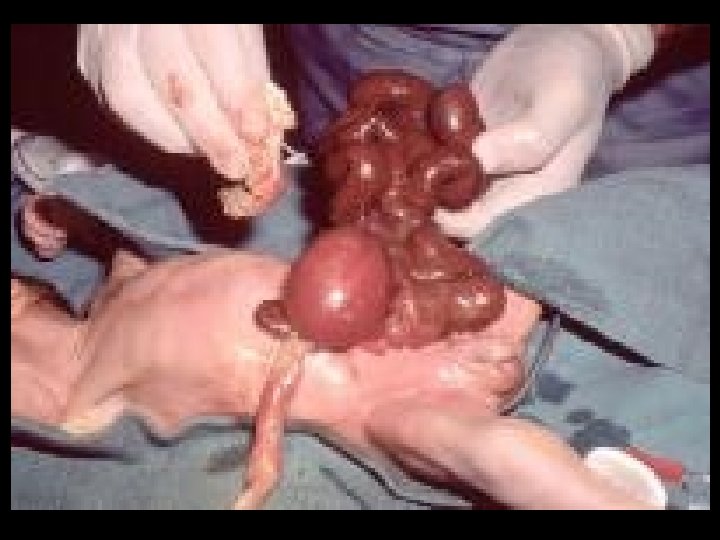 Abdominal wall defects Omphalocele Covering sac with cord 10 -20% premature Other major anomalies cardiac, CNS, renal syndromes, trisomies malrotation Liver may be in sac Malabsorption Gastroschisis No sac, cord to the side 50% premature, SGA common Occasional minor anomalies intestinal atresias Liver never out Malabsorption, prolonged ileus