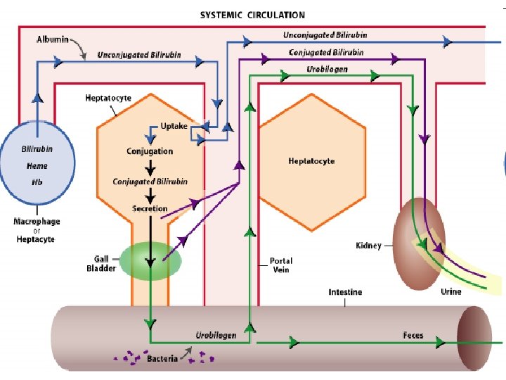 Cont. . – Bilirubin from erythropoietic heme is produced by monocytic macrophages, reticuloendothelium, in every organ but especially in the spleen, liver and bone marrow. – The bilirubin from non-erythropoietic hepatic heme is produced in the hepatocytes. HEME + Heme oxygenase = OXY- HEME ( closed tetrapyrrolic ring with iron) OXY- HEME + heme reductase = BILIVERDIN (open tetrapyrrolic ring without iron) BILIVERDIN + biliverdin reductase = BILIRUBIN (unconjugated)