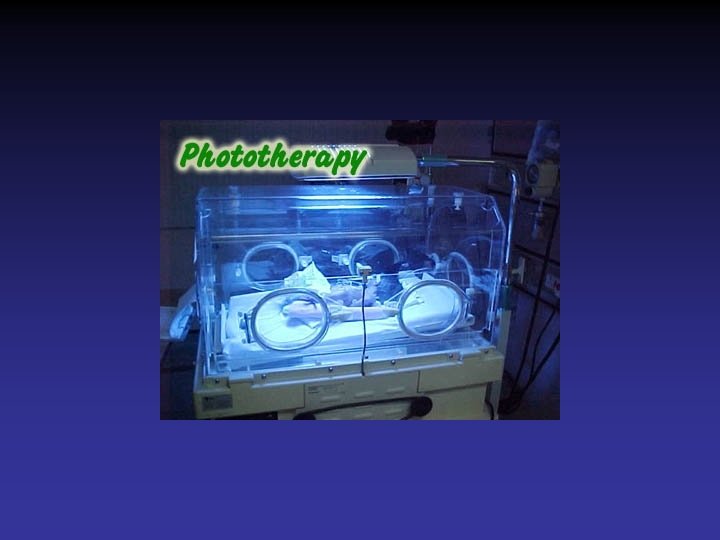 Phototherapy • Mechanism of action – Skin exposure to lights causing geometric photoisomerization allowing excretion • Technique – Light source • Lamps, spotlights, fiber optic blankets, • Blue light • Wave length: 420 -500 nm – Positioned 50 cm above infant – Largest surface area possible exposed