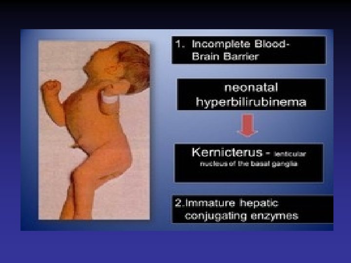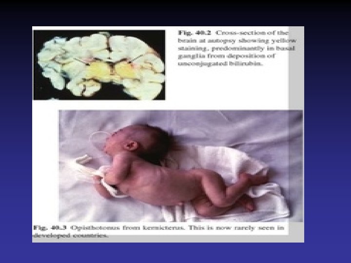 Bilirubin Encephalopathy • Deposition of unconjugated bilirubin in the basal ganglia and brainstem nuclei causing neurotoxic effects • Acute manifestations are lethargy & poor feeding • Severe cases, irritability, increased muscle tone opisthotonos, seizures and coma • Survivors may develop choreoathetoid cerebral palsy (due to damage to the basal ganglia), learning difficulties and sensorineural deafness