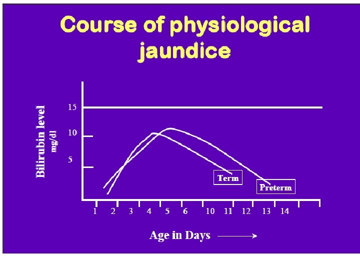 Physiological Jaundice Characteristics • Appears after 24 hours • Total bilirubin rises by less than 5 mg/dl per day • Maximum intensity by 4 th-5 th day in term & 7 th day in preterm • Serum level less than 15 mg / dl • Clinically not detectable after 14 days