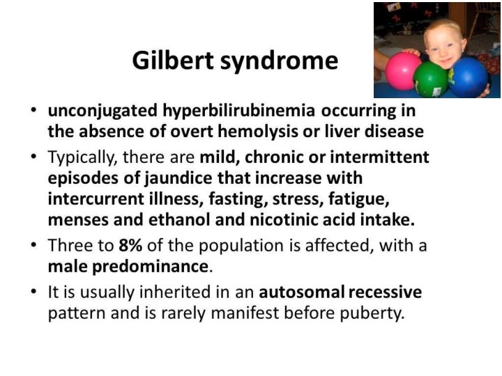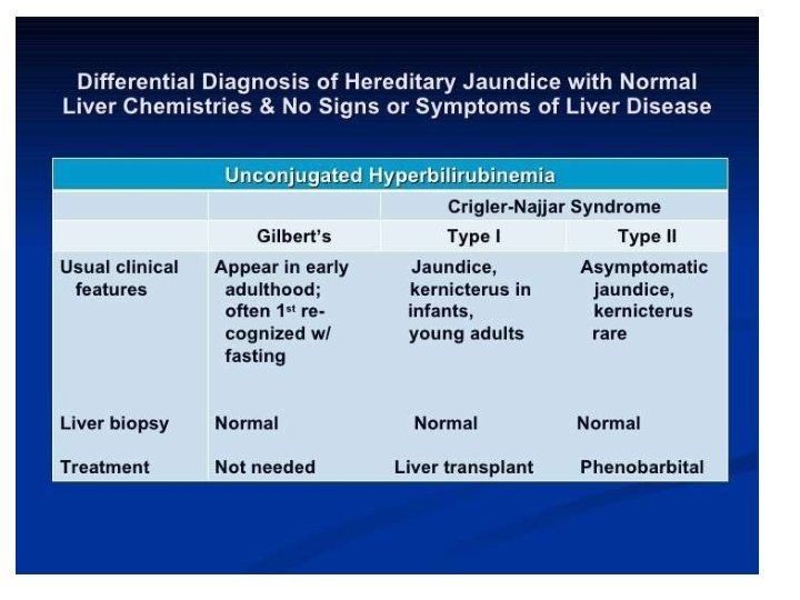 • Crigler-Najjar syndrome type I - rare • Complete absence of UDPGT and is characterized by severe hyperbilirubinemia with the ongoing risk of kernicterus at any point during an individual's lifespan. • Currently, liver transplantation is the only definitive therapy • Patients with Crigler-Najjar syndrome type II partial absence of UDPGT similar to type I but dramatically respond to therapy with phenobarbital, which is how the diagnosis is made Glucuronyl transferase