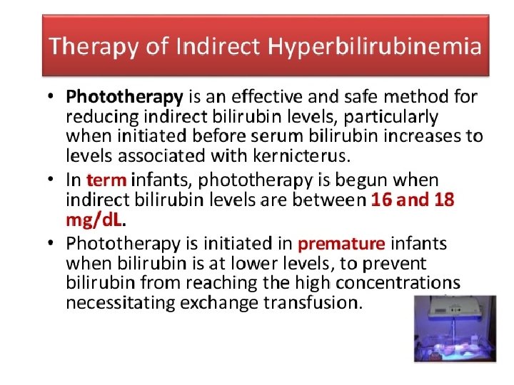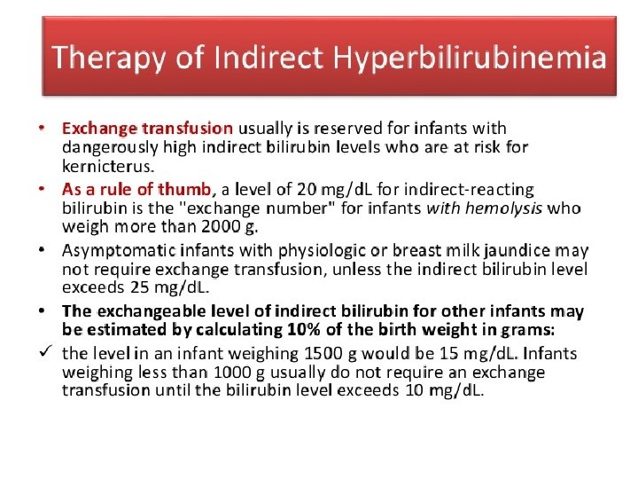 Remember that: • Jaundice is the most frequent cause of admission after early discharge from nursery. • It is not physiological if: appear in first 24 hrs, increases by > 0. 5 mg/d. L/hr , evidence of hemolysis, abnormal examination, direct bilirubin is > 20% of total, or persists > 3 weeks. • Jaundice present in the first 24 hrs of life must be investigated and treated as an emergency.