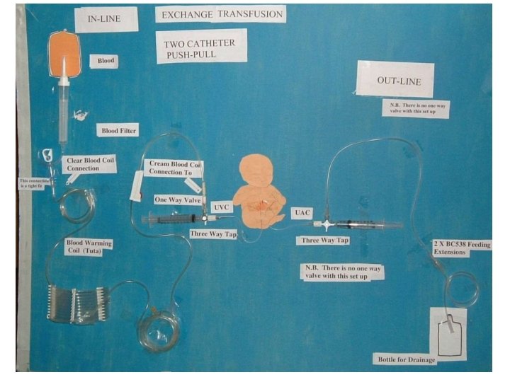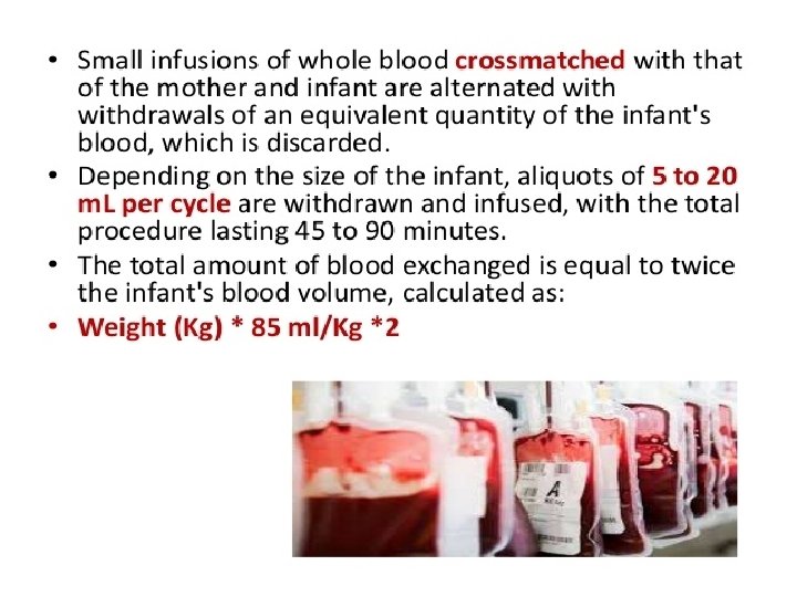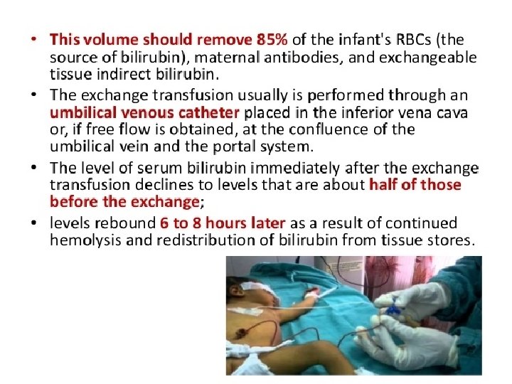 Exchange transfusion • Exchange transfusion is indicated for avoiding bilirubin neurotoxicity when otherapeutic modalities have failed or are not sufficient. • the procedure may be indicated in infants with erythroblastosis who present with severe anemia, hydrops, or both, even in the absence of high serum bilirubin