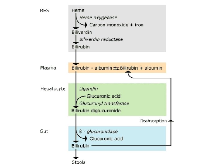 Types of bilirubin Unconjugated bilirubin (Indirect ) Conjugated bilirubin (Direct ) • Bind to albumen • Conjugated with glucoronic acid • Fat soluble • Water soluble • Can cross blood brain barrier • Excreted in urine and stool • Toxic in high level to brain • Not toxic