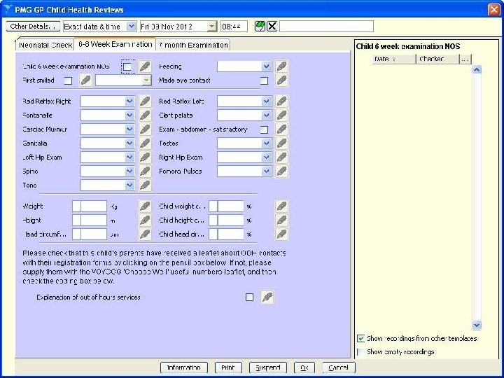 Newborn and 6/52 check • Head to toe… – General – Head • • • Fontanelles Eyes Palate Tongue Ears – Chest – Abdo • Umbilicus • Genitals • Anus – – – Spine Hips & femorals Feet Skin Tone