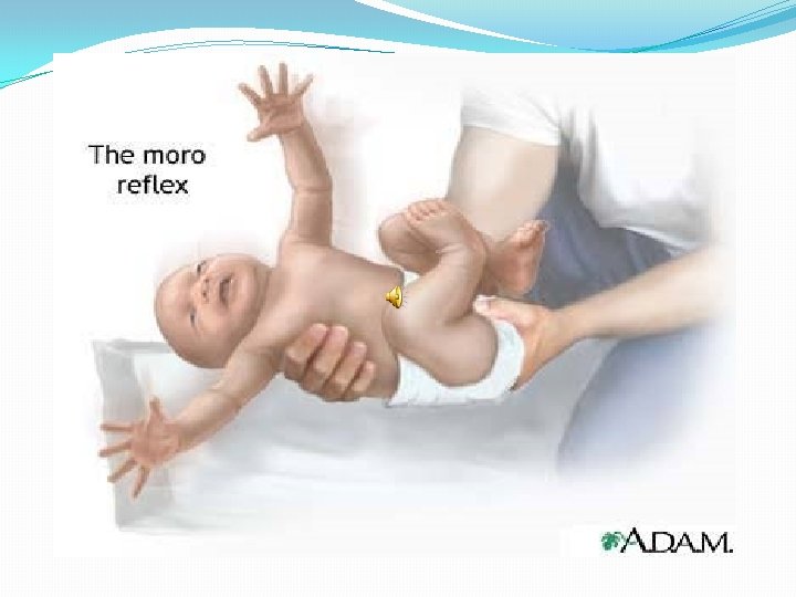 1. MORO REFLEX�The baby should be held supine over the right hand arm, the flexed head is suddenly allowed to drop by about 30 angle. � A positive response consists of rapid abduction and extension of upper limbs and opening of hands followed by slower adduction and flexion. � Moro response is asymmetric in brachial palsy and fracture of clavicle or humerus.