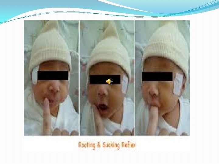 2. Glabellar Tapping of nasion is followed by closure of eyes in infants above 30 weeks gestation. 3. Rooting and Sucking reflex. Stimulation of angle of mouth or lips would initiate rooting and sucking in infants above 34 weeks gestation
