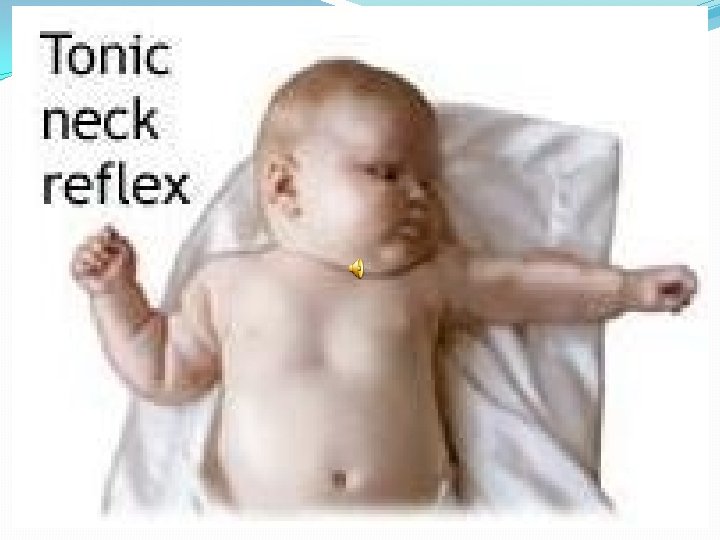 4. Tonic neck reflex. When the baby's head is turned to one side , the ipsilateral arm and leg gets extended while contralateral limbs are flexed. If a baby constantly or persistently maintains, the tonic neck posture , it is abnormal and may signify future development of cerebral palsy.