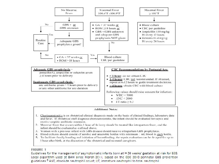 Maternal factors • Intrapartum temp >= 100. 4 • Delivery < 37 weeks (preterm!) • Chorioamnionitis (CAM)- sepsis risk increases 4 x) • Rupture of membranes >= 18 hrs – 10 x risk • Intrapartum antibiotic prophylaxis n. b. – ½ of moms delivering infants with EOS received abx.
