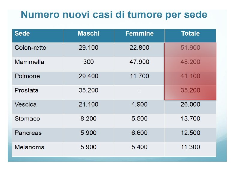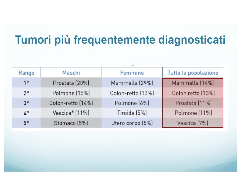 Incidenza Il tumore della prostata è attualmente la neoplasia più frequente tra i soggetti di sesso maschile. Tabella 4 e rappresenta oltre il 20% di tutti i tumori diagnosticati a partire dai 50 anni di etàTabella 11. L’incidenza del carcinoma prostatico ha mostrato un trend in crescita fino al 2003 Tabella 21, Figura 17, in concomitanza della maggiore diffusione del test del PSA quale strumento per la diagnosi precoce dei casi prevalenti, e successivamente un andamento in diminuzione. Per il 2015 sono attesi circa 35. 000 nuovi casi. Come per altre neoplasie è presente un gradiente Nord-Sud tra le diverse regioni italiane: rispetto ai 99, 8 casi/anno tra residenti del Nord-Italia, le regioni del Centro registrano un meno 20% (79, 8/100. 000) e quelle del Sud meno 33% (66, 8/100. 000)Tabelle 22 -23, dato anch’esso riferibile alla diversa distribuzione geografica di molteplici fattori, in primis la diffusione del test PSA.