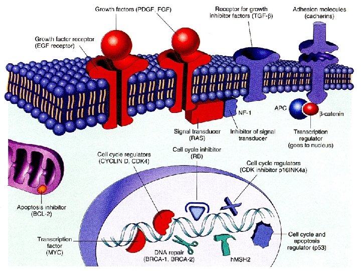 Normal Genes Damaged in Cancer • Genes that promote growth (“proto-oncogenes”) • Genes that inhibit growth (“tumor suppressor genes”) • Genes that regulate apoptosis • Genes that repair DNA