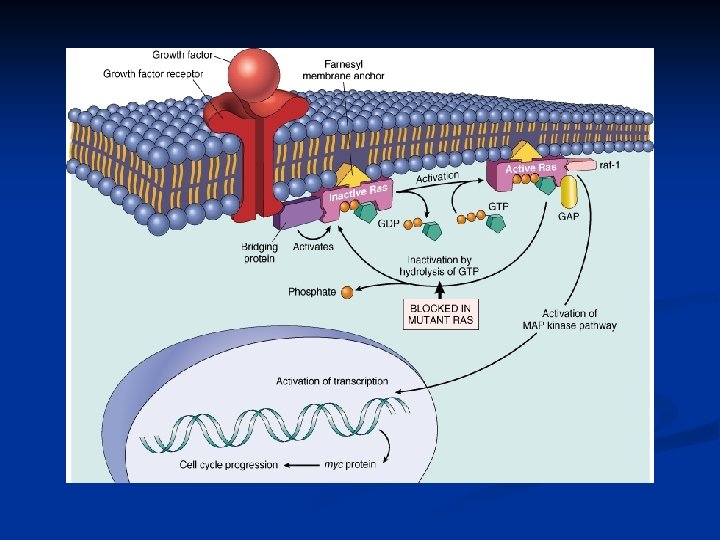 Carcinogenesis n RAS : 30% of all human tumors contain mutated RAS gene. E. g : colon. Pancreas cancers n Mutations of the RAS gene is the most common oncogene abnormality in human tumors n Mutations in RAS --- cells continue to proliferate n