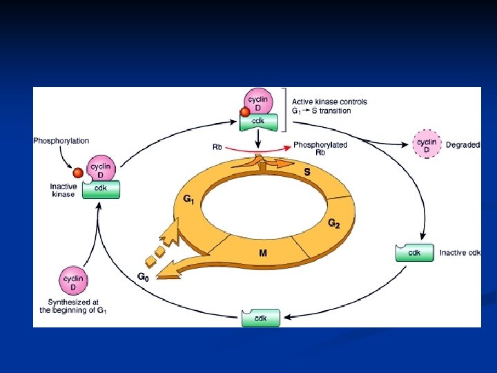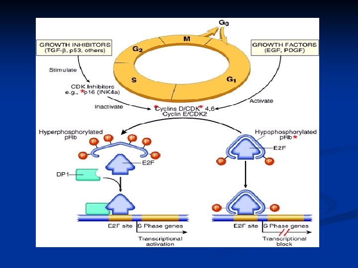 Carcinogenesis RB gene exists in “ active “ and “ inactive” forms n If active will stop the advancing from G 1 to S phase in cell cycle n If cell is stimulated by growth factors inactivation of RB gene brake is released cells start cell cycle …G 1 S M …then RB gene is activated again n