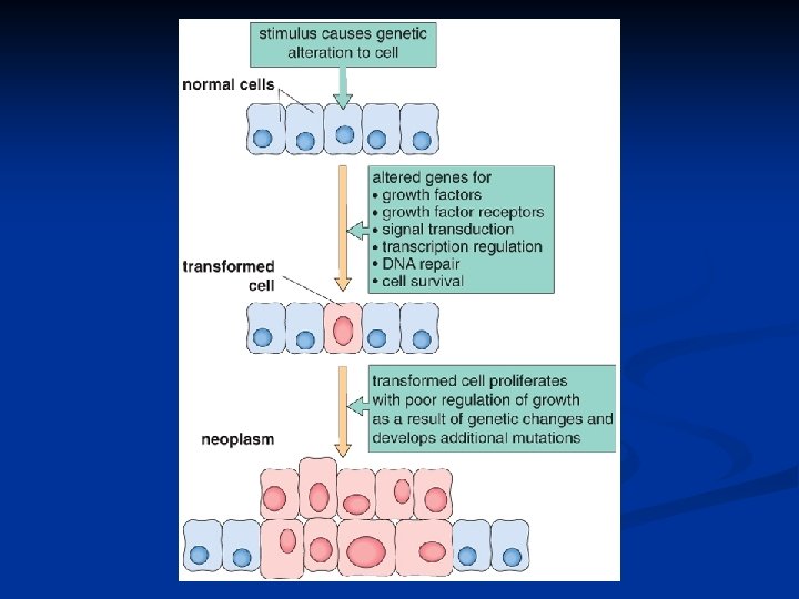 Carcinogenesis Genetic damage lead to “ mutation” n single cell which has the genetic damage undergoes neoplastic proliferation ( clonal expansion) forming the tumor mass n