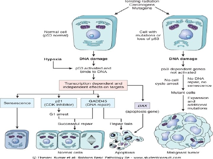 Carcinogenesis With loss of P 53, DNA damage goes unrepaired n Mutations will be fixed in the dividing cells, leading to malignant transformation n
