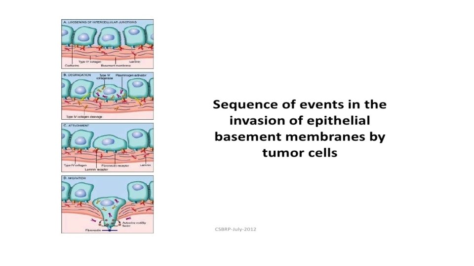 • Invasion of ECM ( both basement membrane or interstitial matrix) is a dynamic process that needs several steps. • 1. loosening of tumor cells • 2. degradation of ECM • 3. Changes in attachment of tumor cells to ECM proteins • 4. locomotion
