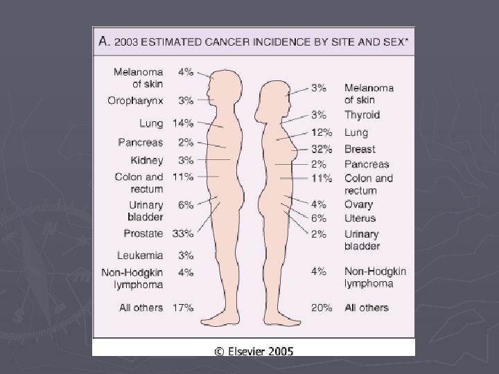 Epidemiologia ► Estudios epidemiológicos ayudan a conocer relación de factores ambientales, raciales ( hereditarios) y culturales con cancer. ► Sexo: Hombres: Próstata, pulmón y cáncer colorectal. Mujeres: Ca de mama, pulmón y colon- recto.