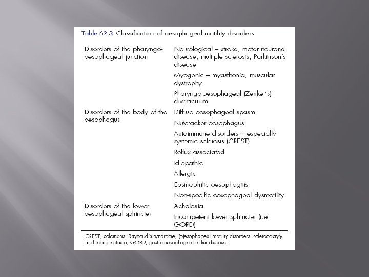 � Extended surgical myotomy improve dysphagia but not chest pain. Nutcracker esophagus: � � The pressure inside reach 180 mm. Hg. It present with chest pain which is caused by reflux rather than the pressure, so its treated by antacid agents.