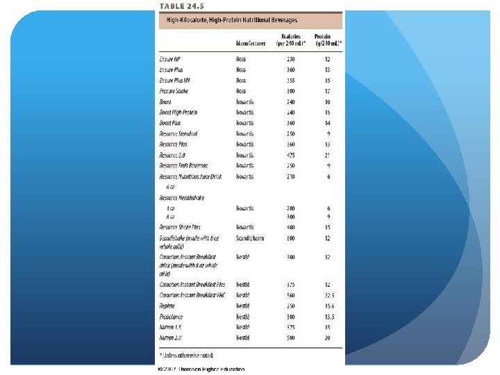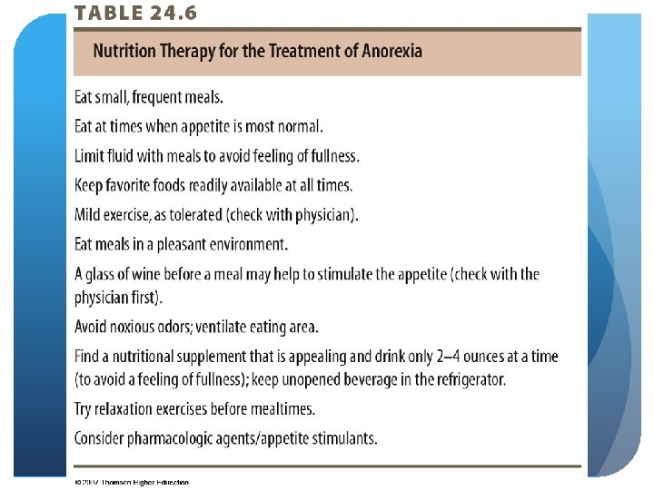 Nutrition Interventions Nutrition Support Home nutrition support May maintain quality of life Lack of appetite and food intake may be greater concern to family members, caregivers than to pt.
