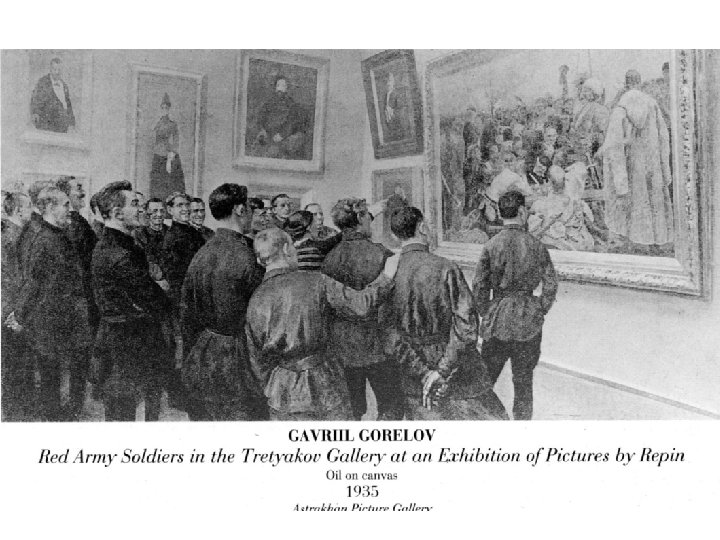 predistorija I - peredvižnjici (c. 1860 -1890) • Prva manifestacija osporavanja akademskih, neoklasičnih i romantičarskih pojava u ruskoj umetnosti – realistički pokret Peredvižnjika (trinaest umetnika koji su 1863. istupili iz Akademije umetnosti sa željom da “unesu umetnost u narod”) • Pokret se razvijao paralelno sa progresivnom ideologijom tog vremena suprotstavljajući se i tradiciji i l’art pour l’art-u: umetnost mora da se prvenstveno bavi stvarnošću, mora da ima društvenu i političku funkciju, da bude aktivna snaga u borbi za reformu društva; • Neki smatraju da su njihovi ciljevi bili više praktični – sticanje profesionalne nezavisnosti, novih poručilaca (prihoda) kao i društvenog statusa kao pripadnika inteligencije