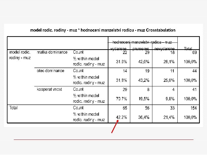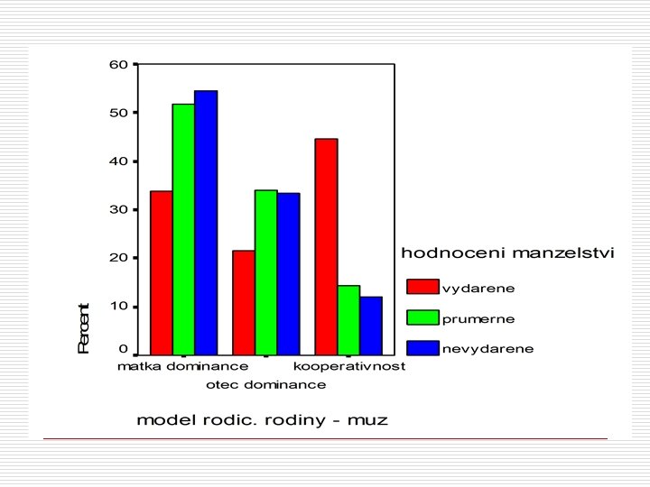 Příklad o zajímá nás, jak souvisí model manželství s jeho vydařeností n n o model manželství má kategorie: dominance žena, dominance muž, kooperace vydařenost má 3 kategorie – vydařené, průměrné, nevydařené pozn. : jde o manželství rodičů respondentů, tak je posuzují oni (zdroj dat – výzkum doc. Plaňavy)