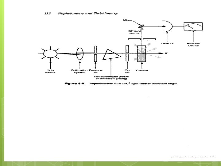 Nephlometry is differs from turbidimetery in the arrangement of the photometer, since turbidity measurements are made in the same direction as the propagation of the light from the source. While the nephlometry is measure the light scattered at right angle to the direction of the propagation of light from the source