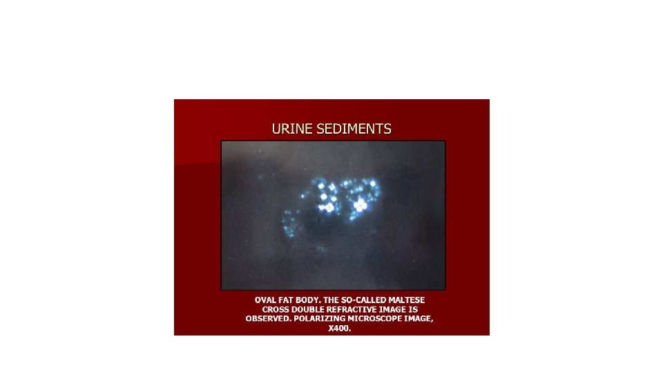 Investigations • Urine dipstick analysis: proteinuria and check for microscopic haematuria. • Midstream urine for microscopy, culture and sensitivities to exclude urinary tract infection. • Quantify proteinuria using an early morning urinary protein: creatinine ratio or albumin: creatinine ratio. • Maltese cross in urin sediment • FBC and coagulation screen. • Renal function tests. • LFTs (to exclude liver pathology); bone profile (calcium, phosphate, alkaline phosphatase). • Check for other systemic diseases and causes of nephrotic syndrome: ESR and CRP. Fasting glucose. Immunoglobulins, serum and urine electrophoresis. Autoimmune screen if an underlying autoimmune disease is suspected: autoantibodies and complement levels. • Hepatitis B and hepatitis C; HIV. • •
