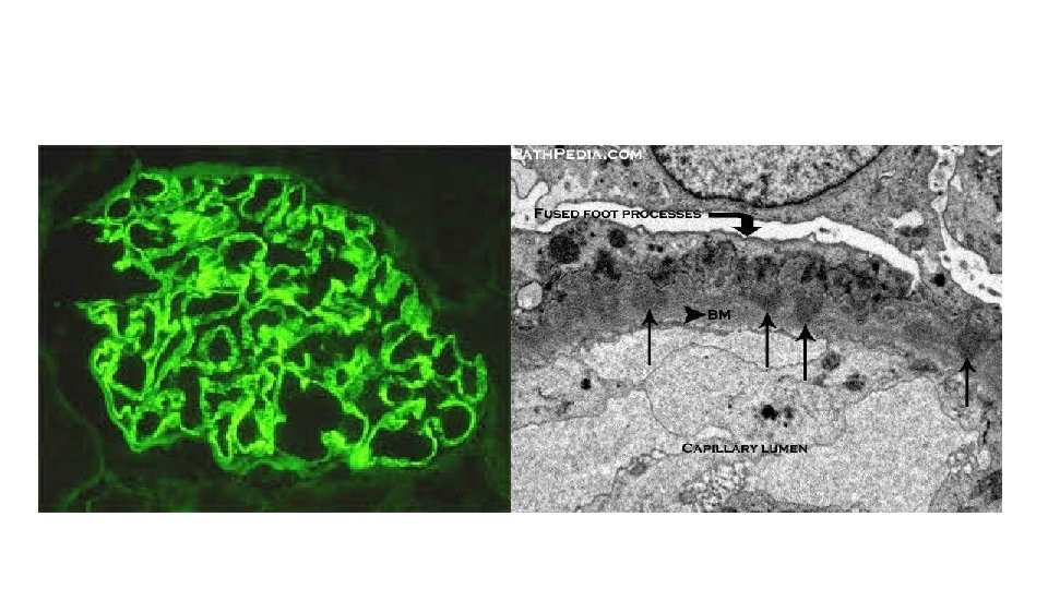 Pathogenesis • the glomerulus becomes permeable to large molecules (e. g. , albumin) • this loss of albumin (proteinuria) results in hypoalbuminemia and edema • associated with a hypercoagulable state • pathophysiology unclear but may be due to loss of antithrombin and plasminogen proteins • increased lipid synthesis secondary to proteinuria • this in turn results in hypercholesterolemia and hyperlipidemia