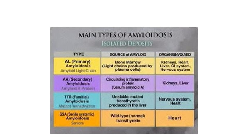 Amyloidosis • How many types of amyloidosis do you know ? • What are the causes ? • How does it manifest ? • Ho is it diagnosed ?
